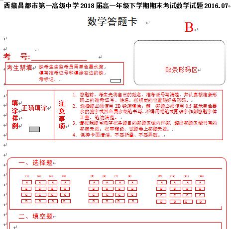 2016-08-22西藏昌都市第一高级中学2018届高一年级下学期期末考试数学答题卡