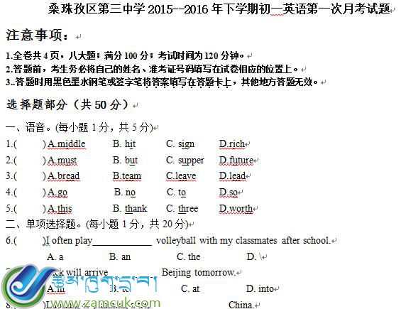 科目:藏语下册