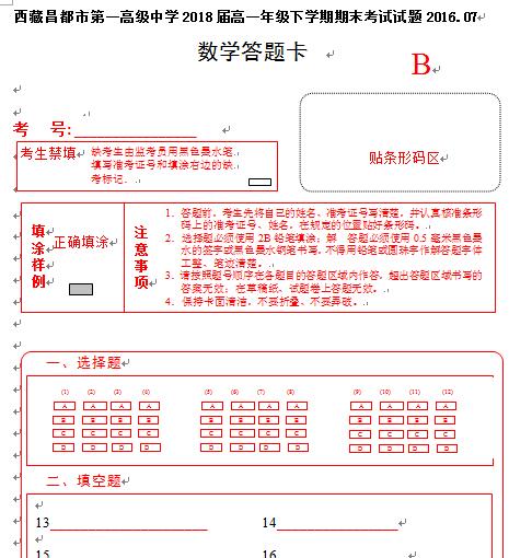 2016-08-22西藏昌都市第一高级中学2018届高一年级下学期期末考试数学答题卡